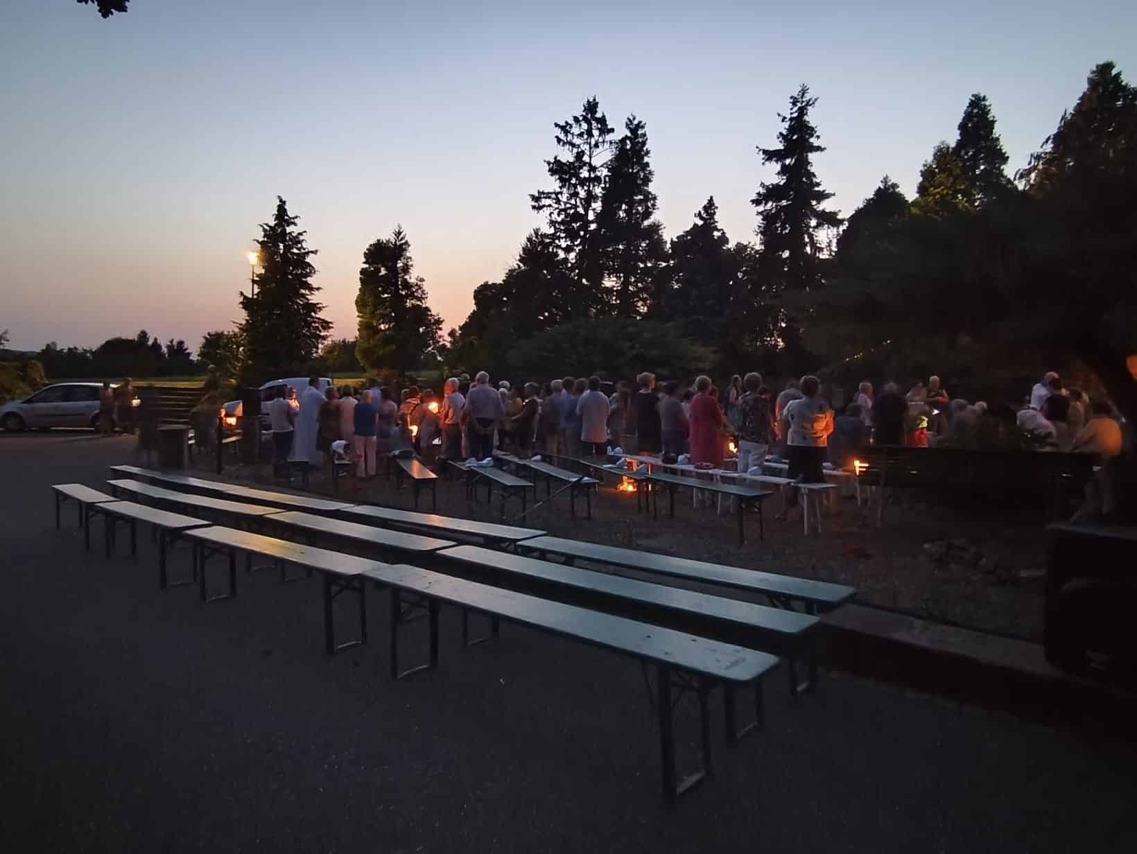 Une fois arrivés au sommet de la colline où les autres personnes attendaient, tous ont pu vivre ensemble la messe de la Vigile de l’Assomption – à la lueur des cierges et au soleil couchant.