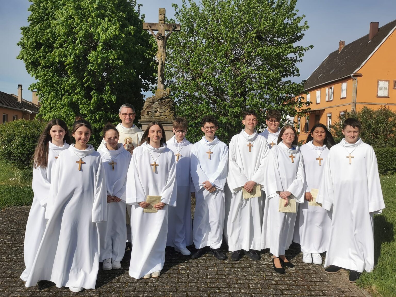 Dimanche de la Divine Miséricorde, 27 avril 2025, ce fut jour de la Profession de Foi où 11 jeunes de la communauté paroissiale du Val de Moder ont renouvelé la foi de leur baptême. Cette célébration s’est tenue en l’église de Uberach, toute illuminée par la lumière printanière du soleil, ce qui aura été aidé à la solennité de cet heureux événement. Les beaux chants, les belles fleurs et autre icône ont embelli la ferveur et la prière des familles et des jeunes eux-mêmes – invitation pour eux à poursuivre leur vie de foi et d’amitié avec le Christ.